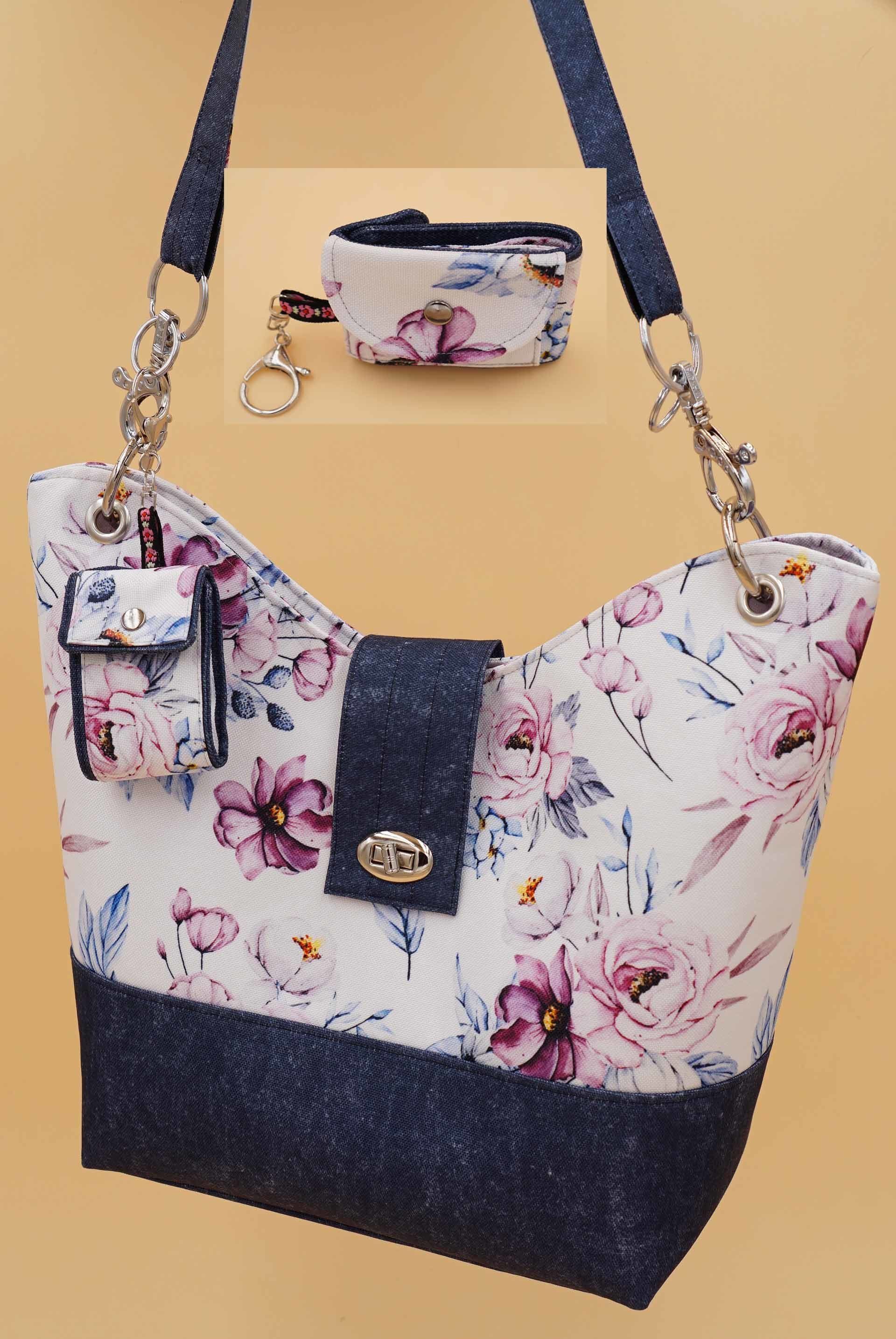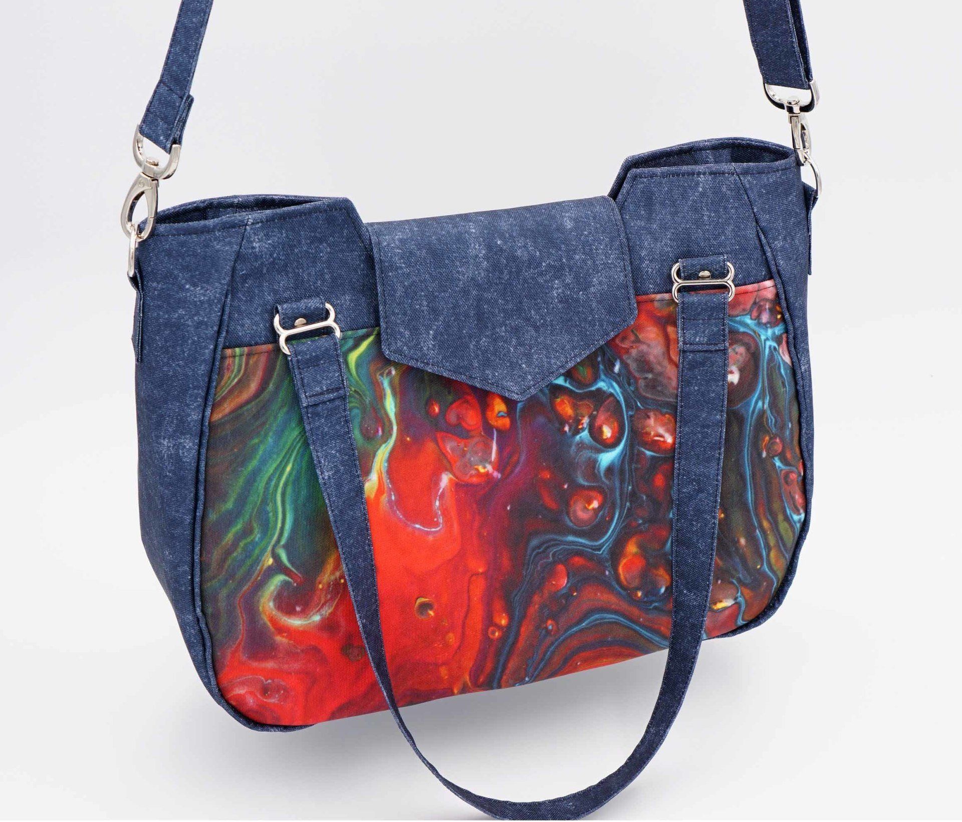 ButtonShamballa Bags-Fiorella in verschiedenen Farbkombinationen mit Steckschloß, 24x24x8,5 cm, Material Baumwoll-Twill/Jeansstoff oder Baumwoll-Satin/Kunstleder, Innenfutter Baumwolle, Reißverschlußfach und Steckfach innen