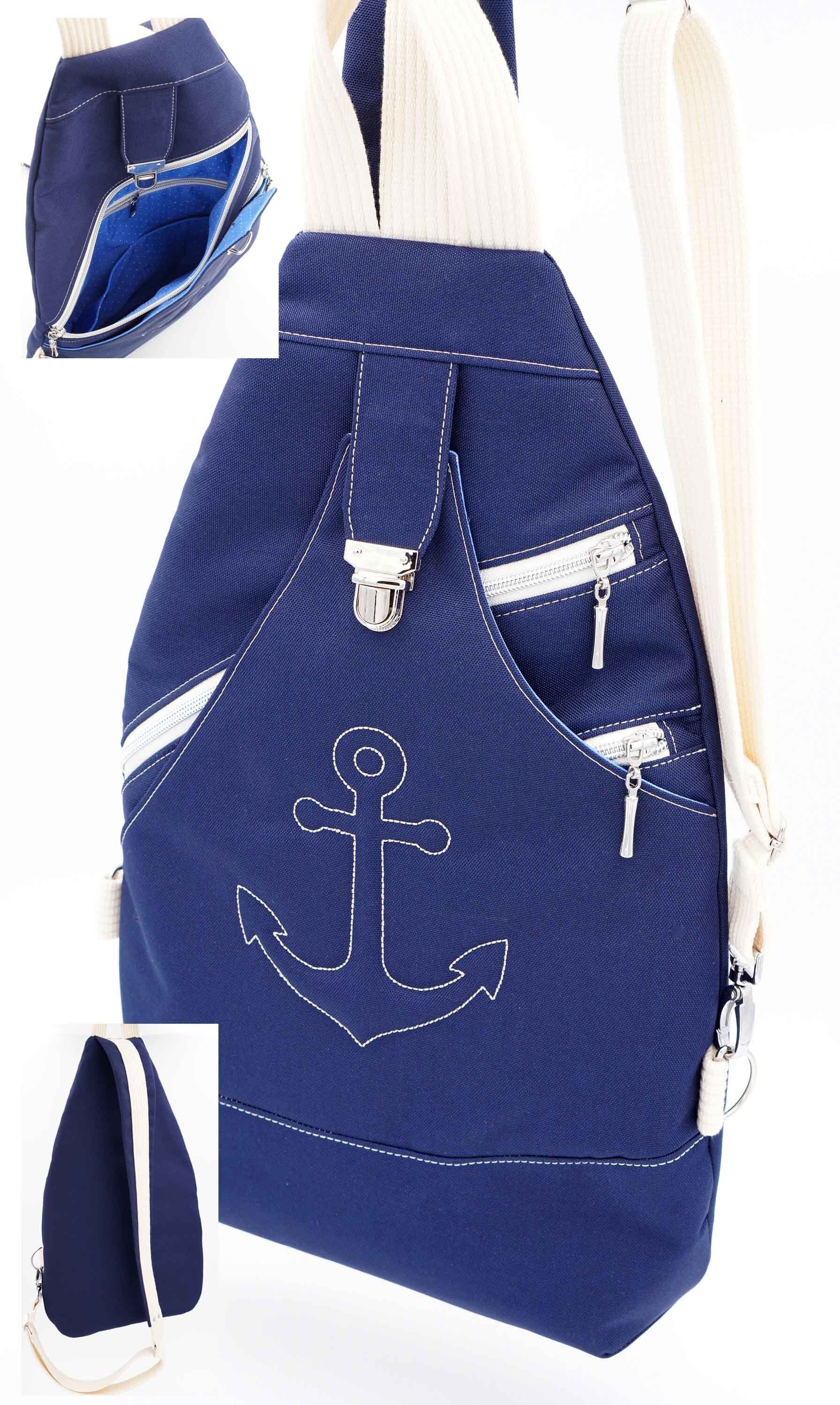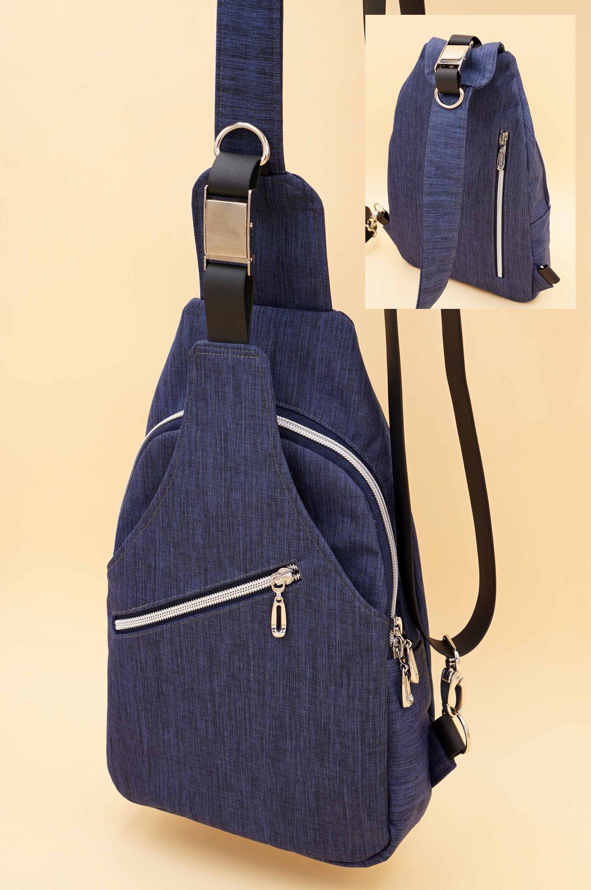 ButtonSling Bagpack Blau mit Reißverschluß, 35x22x5 cm, Material beschichtete Baumwolle, Innenfutter Baumwolle, Außen RV-Fächer und verstecktes Steckfach, Innen RV- und Steckfach, mit verstellbarem Tragegurt