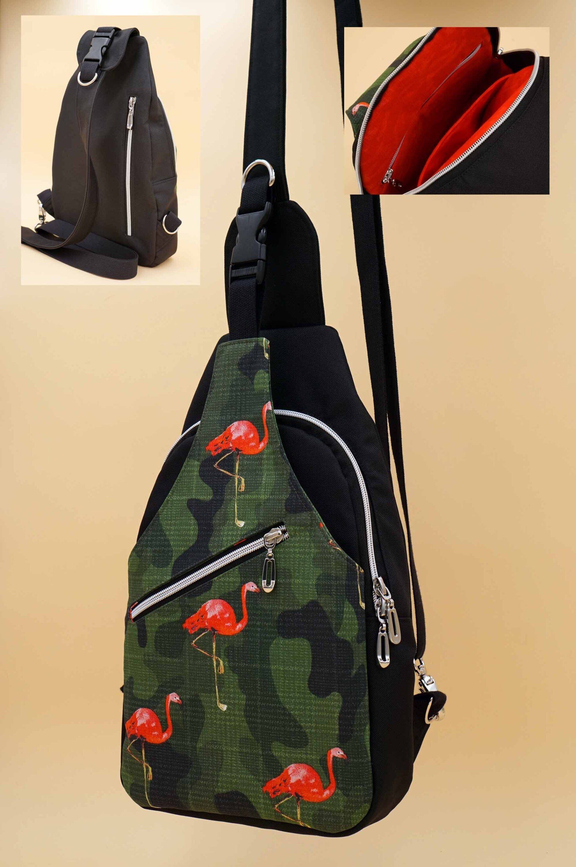 ButtonSling Bagpack Flamingo mit Reißverschluß, 35x22x5 cm, Material beschichtete Baumwolle, Innenfutter Baumwolle, Außen RV-Fächer und verstecktes Steckfach, Innen RV- und Steckfach, mit verstellbarem Tragegurt