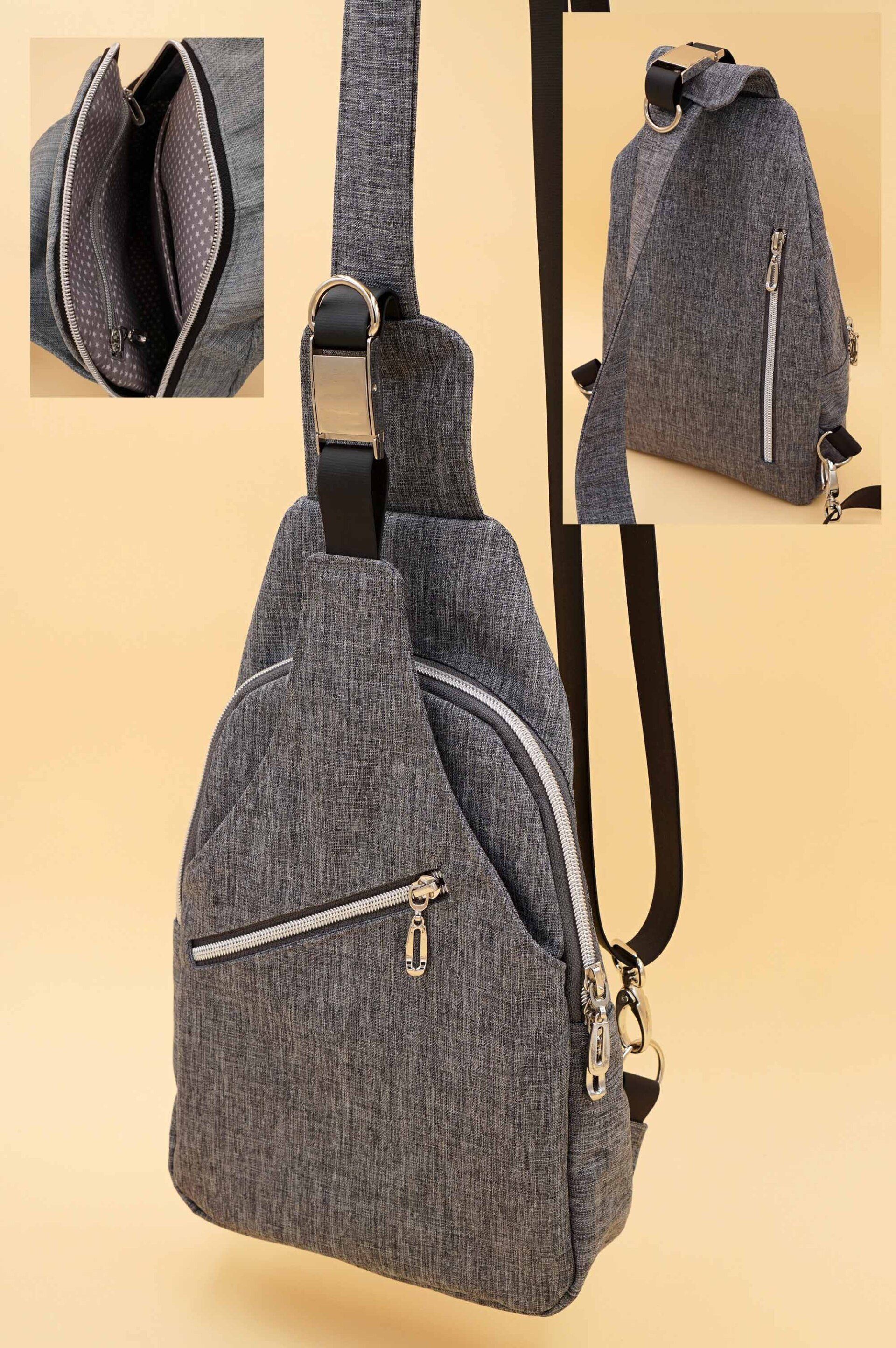 ButtonSling Bagpack Grau mit Reißverschluß, 35x22x5 cm, Material beschichtete Baumwolle, Innenfutter Baumwolle, Außen RV-Fächer und verstecktes Steckfach, Innen RV- und Steckfach, mit verstellbarem Tragegurt