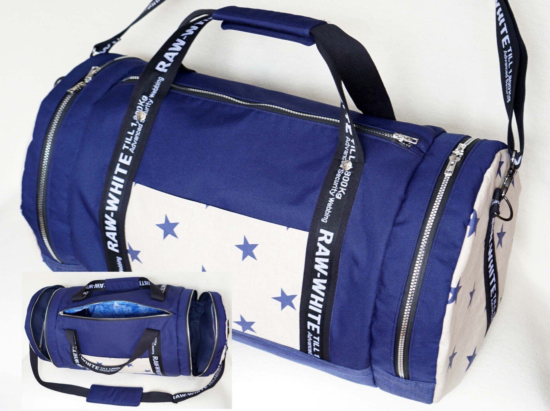 ButtonUhOh Creations-Keanu Duffel Bag mit Reißverschluß und gepolstertem Schultergurt, 30x55x30 cm, Material Cordura beschichtet und beschichtete Baumwolle, Innenfutter beschichtete BW, Innen 3 RV-Taschen, 1 aufgesetzte Tasche außen, zwei separate RV-Außentaschen